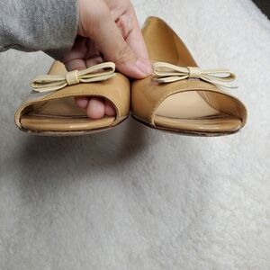 Excellent condition. Gently used. Tan/Nude/Beige. Patent leather. Bow detail. Peep toe. Low wedge heel.
