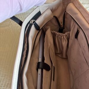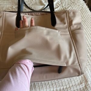 Sleeve for laptop and tablet. Water bottle pocket. Front zipper pocket. Multiple interior zipper pockets. Over shoulder tote. Nylon light pink