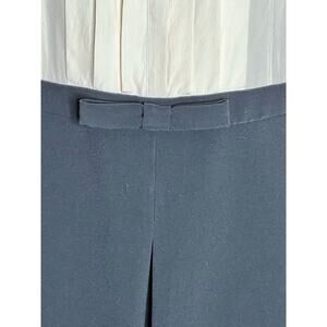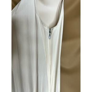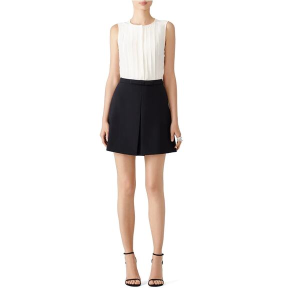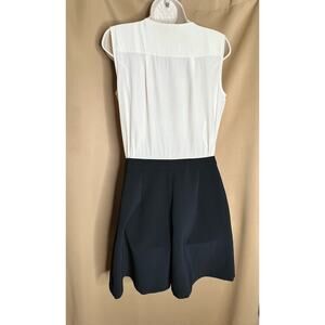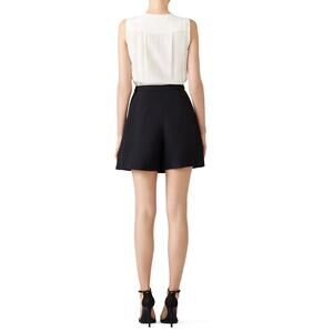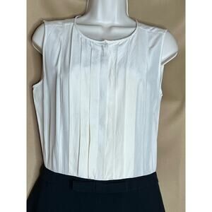 Black and cream silk and crepe romper. Top 100% silk Bottom 90% polyester, 10% spandex. Sleeveless. Crew neckline. Hidden side zipper with hook and eye closure. Button closure down front. 35” from shoulder to hemline.