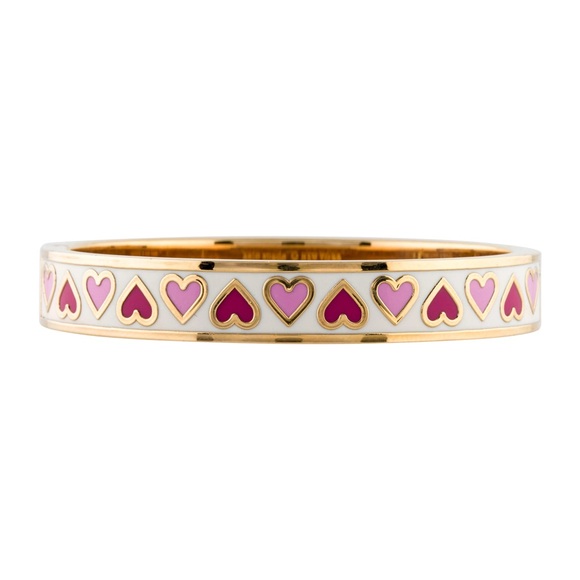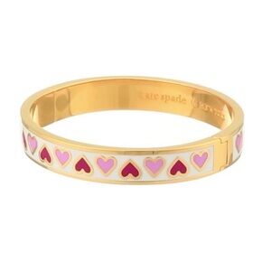 Novelty bangle with 12-karat gold plated metal and pink/red hearts on white enamel detail. Engraving of “Unlock My Heart” on interior. Magnetic closure with hinge. Brand new without original tag.