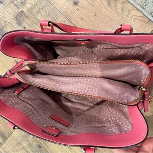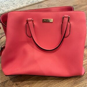 Bright pink satchel with elegant design. Features dual handles and a shoulder strap. Perfect for adding a pop of color.