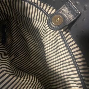 Ostrich Embossed Cowhide with matching trim. Great condition! Only carried a few times. Open top interior tab with magnetic strap. Kate Spade gold plated hardware and 2 shoulder straps with matching gold chain and leather. 9.5" strap drop & 4 gold plated metal feet.
