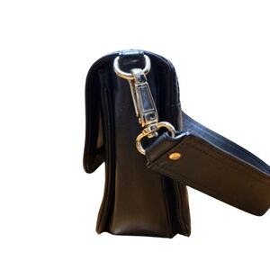 Irving Place Kate Spade Harlow style black shoulder bag. It has one leather strap that is removable with a hook closure. The hardware is light gold tone and the front is a flap closure with a turnlock. Directly below the turnlock, the words “Kate Spade New York” are engraved in the hardware. The inside is lined with black and gray polka dots on white fabric. There are three separate sections on the inside and the center section has one zipper pocket. This is a striking shoulder bag with a classic Kate Spade style.