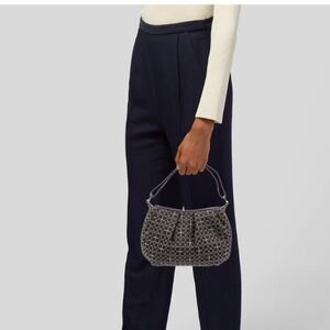 Main zipper closure, blue suede lining with one zip compartment inside.