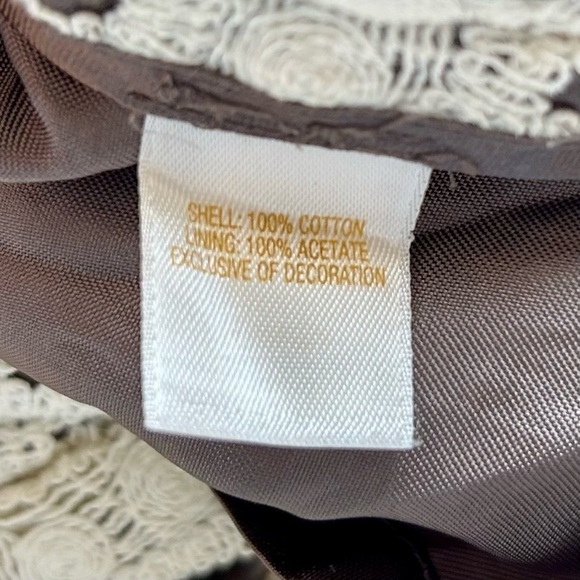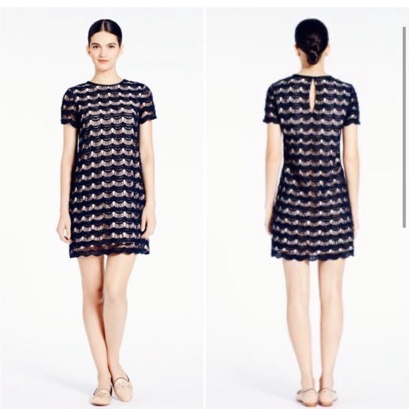 This Virginia Ivory Lace Shift Dress from Kate Spade features stripes of scalloped ivory lace with a gray silver brown lining, short sleeves, round neckline, and a sleek shift silhouette. Fully lined with a concealed back zipper