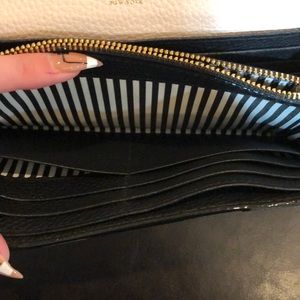 Kate Spade color block wallet. Has room inside for 14 cards. Inside has coin zipper and back outside also has small zipper. It is super roomy and spacious. In great condition, except for small flaw on the back of wallet (shown in last picture). Wallet is a pebble grain leather