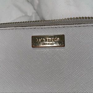 Used Kate spade wallet, color is light gray, baby blue-ish undertone. 12 card slots, the kate spade branding is a little scratched (shown in picture with flash on). All pictures were taken with flash. Measures about 8 in by 4.25 in. Comes from a smoke free pet friendly home