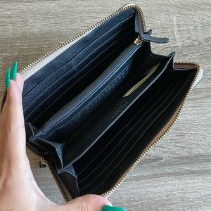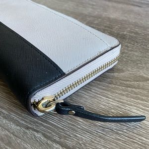 Gently used Kate Spade two-tone wallet. Some discoloration on outside zipper and fraying of inside zipper, both shown.