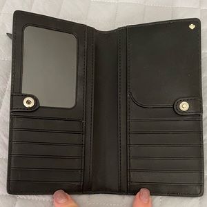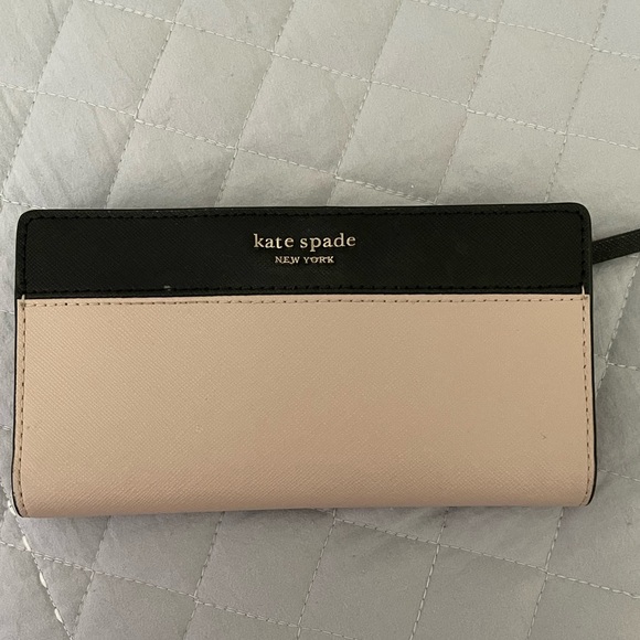 Kate spade wallet- this is a thin style wallet, perfect for a smaller handbag. The wallet still has tons of card space. Is a classy black and tan color. There are a few small marks (see photos) but is absolutely beautiful. Check out my listing for the matching card holder too!