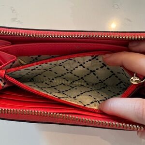 Coral zipper wallet, scratches on gold label, zipper leather looks more worn, some tarnishing on zipper. Inside is quite clean except in the coin compartment