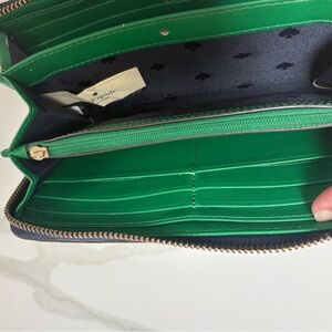 Chic 12 card holder wallet by Kate Spade. Features a stylish navy & white two-tone design with interior green leather details. Perfect for everyday use.