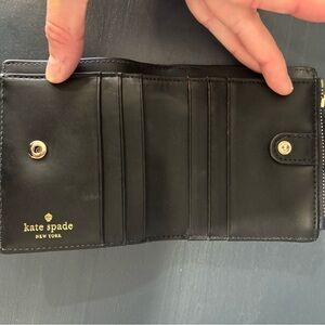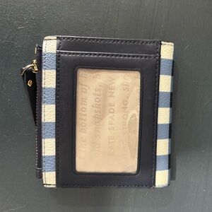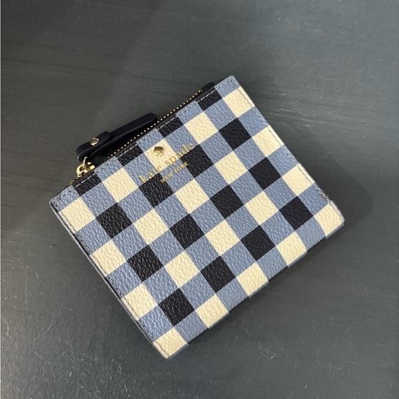 Stylish checkered wallet. Features blue and black pattern. Compact and chic design. Kate spade