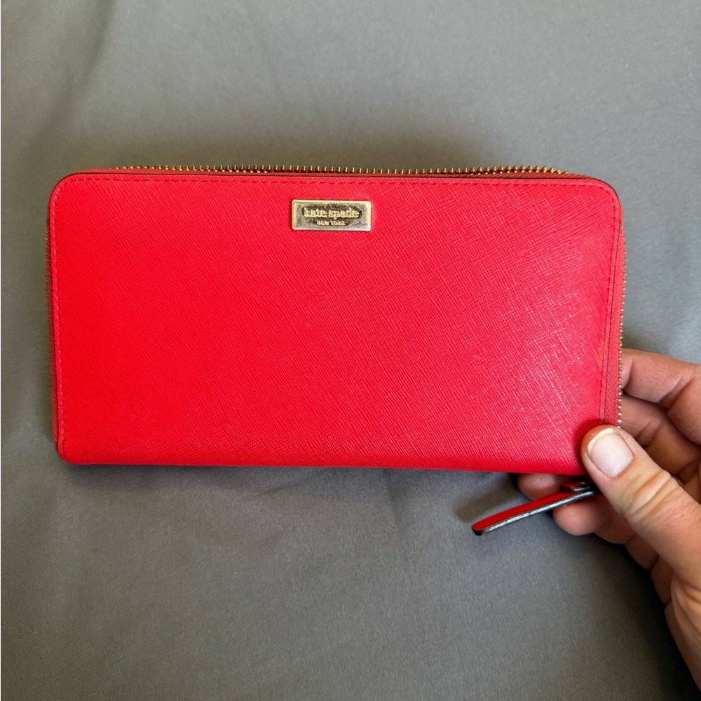 Beautiful Kate Spade wallet is fire engine red, has been my daily so it does have signs of ware and a few small pen marks. But everything works as it should please examine the pictures carefully before buying. Messages me any questions you may have!
