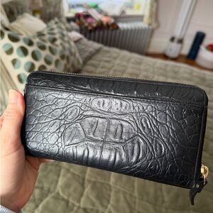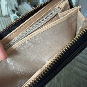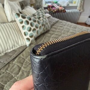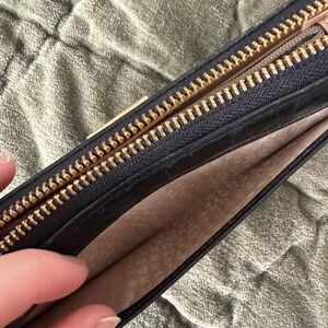 Kate Spade black leather wallet. Used several times but still very clean on the inside. Only one interior section has very small faint staining, pictured. The rest of the interior is in excellent condition. Tons of pockets and storage. This fits everything!! There are some minor scuffs on the corners, overall not too noticeable, also pictured! Some minor scratches to the gold emblem.