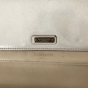 good used condition. there are a few marks here and there which would likely come off with a wipe. lovely cream wallet from kate spade with many compartments. gold detailing