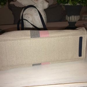 New never been used Adorable Large Canvas Burlap Material. Very Roomy with Pockets! 15W x 11H x 6 depth at base. Perfect all year round Bag!