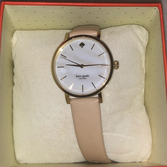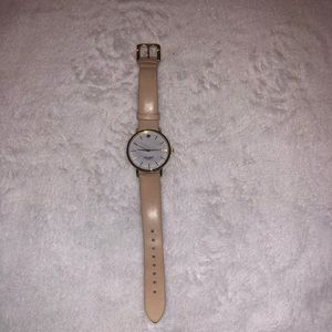 Pearl face, gold rim, and beige band - worn a few times - batteries need to be replaced - add it as a perfect accessory to any outfit