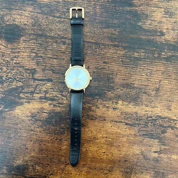 Kate Spade watch with black leather strap. Very comfortable and easy to read. Small speckles of paint on the band.