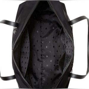 exterior: top zip pocket, front zip pocket, 2 side pockets, back zip pocket to slide on trolly handles