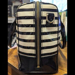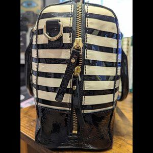 Kate Spade Wellesley Alessa Satchel purse in black and cream patent stripe with gold tone hardware and embossed label. Can be worn as a handbag or comes with detachable/adjustable crossbody shoulder strap.