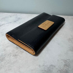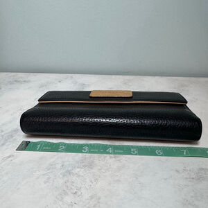 Kate Spade New York Wellesley Jean wallet. The exterior is made of black, pebble textured leather with a tan leather brand patch. It features a snap closure. The interior is tan leather with multiple card slots, bill compartments, and a zippered pocket. The wallet shows signs of light wear, including discoloration on the interior leather. There is also a small scuff on the back. Otherwise in good condition. Smoke free home.