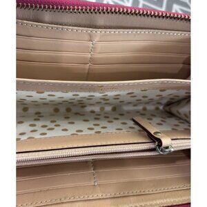 The Kate Spade Wellesley Neda Zip Around Accordion Wallet in Fiesta Rose Pink is a stylish and practical accessory for women. Made of leather with a canvas fabric type, this wallet features a solid exterior with a polka dot interior, giving it a playful and unique look. The wallet includes accents like a zipper closure and Kate Spade logo, and is designed in a zip-around style for easy access to credit cards and other essentials. Perfect for adding a touch of tropical or rose-themed flair to your everyday look, this wallet is a must-have for any fashion-forward woman.