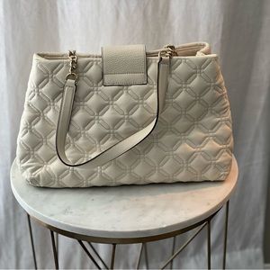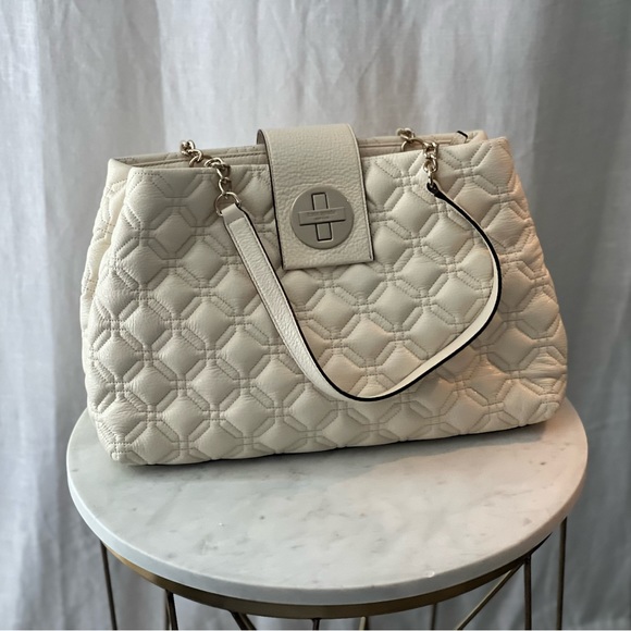 White/off white tote. Pillow soft leather. Chain straps bright red inside. Awesome condition. Basically new. 12 inches at top across. 15 inches across bottle. 10 inch high.