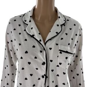 kate spade new york brushed sweater knit fabric pajama top. Contrast V-fold pipping around collar and down center front. Functional buttons up the front. Chest pocket. Long sleeves. White top with black heart print allover. Cotton / modal. Machine wash. 5091456T. In preowned condition, has a pinhole at the back neck (pictured).