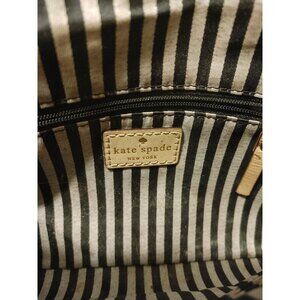 This Kate Spade crossbody bag exudes elegance with its sleek white leather design and tasteful turn lock closure. The luxurious striped lining adds a sophisticated touch, while the adjustable tan strap provides versatility for any occasion. The bag effortlessly combines style and functionality, making it a timeless accessory.