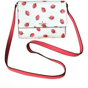 This stylish Kate Spade crossbody bag features a playful strawberry print on a white background. Perfect for adding a touch of fun to any outfit.