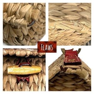 Vintage Wicker Bird House made by Kate Spade in the 90’s. It is in fair to good condition, as it is wicker in the first place so some of it is just simply how it’s made (but noted for the picky). Due to age, the toggle shows some wear, the corners show the wire emerging, and there are some splint pieces of wicker here and there (but also just how wicker is constructed)….Please see “flaws” picture to get a better idea and the one that follows.