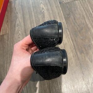 These chic black flats from Kate Spade feature a classic round toe design adorned with decorative bows and a subtle metallic charm. The shoes offer a dressy-casual style, perfect for various occasions, with a comfortable light beige lining that contrasts beautifully with the black exterior.