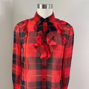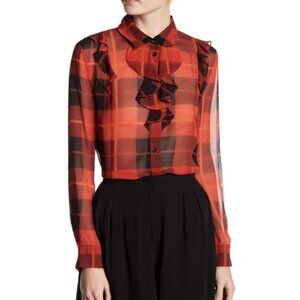 Kate Spade Womens 4 Ruffle Woodland Red Black Plaid Chiffon Blouse 100% Silk Top