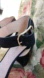 In good condition, but notice the following-there is a little staining on the edge of the ankle straps, there is some wear on the inside by the little toes of both shoes, a little scuffing on heels