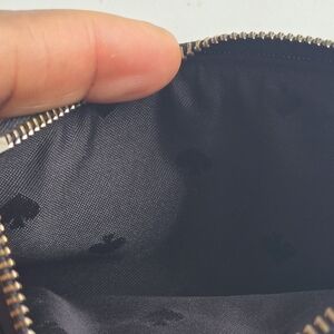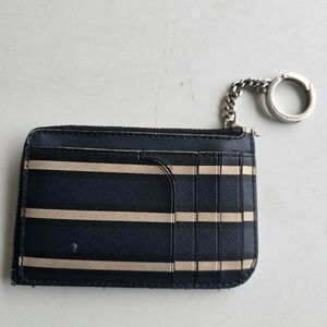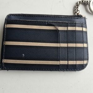 Stylish Kate Spade wallet with black and gold stripes. Features a convenient keychain.This Kate Spade card wallet is a stylish and practical accessory for any woman. Made from high-quality cow leather in a classic black and beige color scheme, it features a corner zip closure and a sleek design with the brand's iconic logo accent. Measuring 5 inches in length and 3.5 inches in width, it is small enough to fit in any handbag or wallet, making it perfect for on-the-go use.