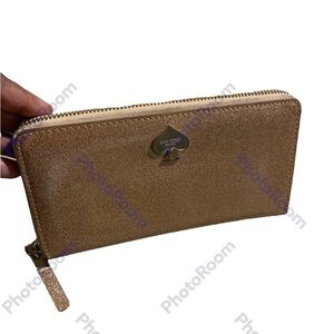 Glittery gold Kate Spade zip-around wallet featuring metallic finish, iconic spade logo, and multiple card slots. Stylish and functional for everyday or evening use.