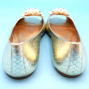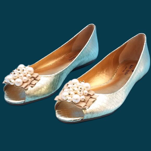 Gorgeous gold croc embossed Kate Spade flats with beautiful pearl accents. The size 6 leather shoes are in very good preowned condition. They would be perfect for a wedding or special event.