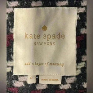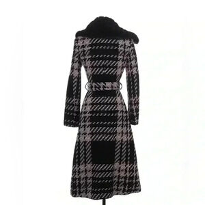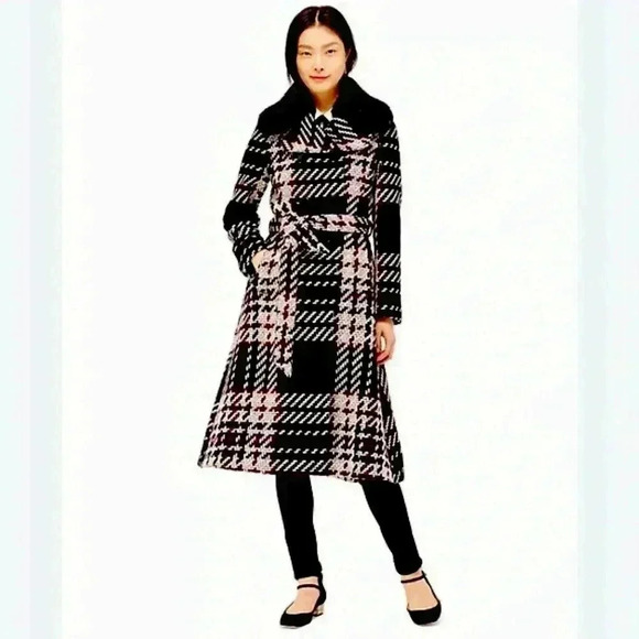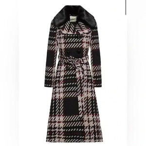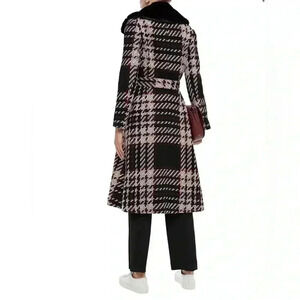 Kate Spade Wool Coat Plaid Belted Long Fur Collar Trim Pink Double Breasted 0 XS