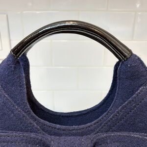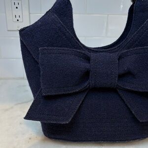Kate Spade Walker Park Tote bag in navy blue felted wool with patent leather handles in EUC. A prominent, oversized bow detail is centrally placed on the front of the bag, adding a feminine and distinctive touch. The handles are rolled and made of black patent leather, providing a contrast to the wool body and a sleek finish. Decorative exterior stitching is visible, enhancing the bag's structure and aesthetic. The interior features a zippered compartment and is lined, often with a signature Kate Spade lining, such as black and white stripes. The bottom of the bag is equipped with four gold-tone feet, designed to protect the material when placed on surfaces. This tote embodies a chic and preppy aesthetic, characteristic of Kate Spade designs. Approximate measurements - 9.5" x 8" x 5.5" Handle drop - 4.5" Photos are the most accurate description of this adorable, preppy, classic satchel tote. Ask questions and make an offer!!
