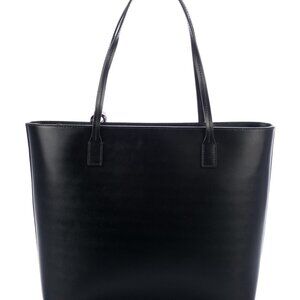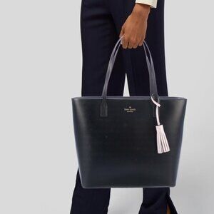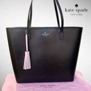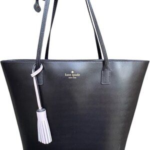 Smooth Black leather Kate Spade New York Wright Place Karla tote with gold-tone hardware, dual flat shoulder straps, foil-stamped logo at front, pale pink tassel accent at side, tonal monogram jacquard lining, three interior pockets; one with zip closure and zip closure at top. Estimated item measurements Shoulder Strap Drop: 8.5" Height: 11.75" Width: 15.5" Depth: 4.25" Excellent used condition