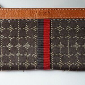 Kate Spade Wristlet Leather Trimmed Printed Tile Weaved Fabric Brown Tan