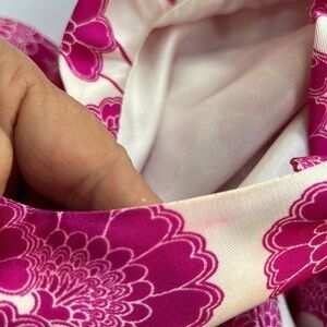 Kate spade X Florence Broadhurst Audrey Silk Floral Wrap dress. White with pink flowers. Ruffle neckline and down side(at wrap). V neck. Wrap silhouette. Ties at front or back. 100% silk(dry clean). Fully lined. In very good used condition(see photos for light fabric bleeding in a few areas and a light stain on ruffle) Price reflects this. size 4
