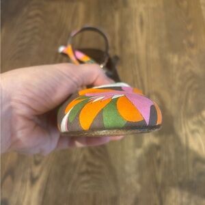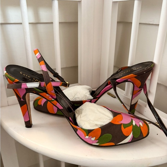 Iconic early-2000s Kate Spade pumps featuring a bold floral printed textile upper, rounded toe, and ankle strap. Made in Italy with leather lining and leather soles, beautifully constructed statement pair!