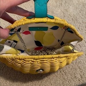 Vibrant yellow wicker bag in a fun lemon shape. Features a teal leaf accent. Used in great condition