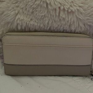Stylish cream zip-around wallet with sleek design.