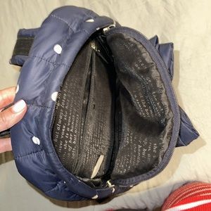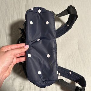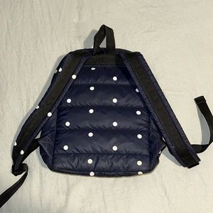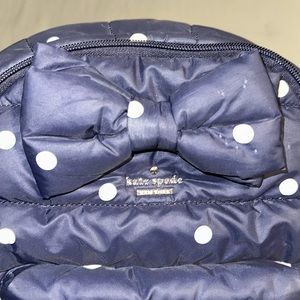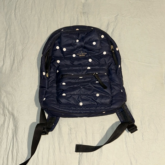 Kate spade mini backpack in navy with white polka dots. Black interior with no marks. Looks like some teeth marks on the front bow but besides that clean and in great condition