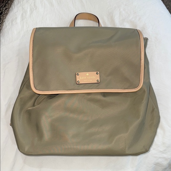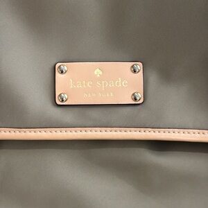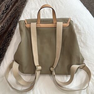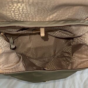 Flexible material. Botton snap to close the top. Inside has one big pocket and two small pockets. In great condition, I have used to travel many times!