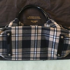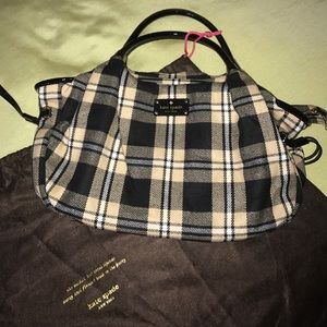 Cloth material. Great condition. Rarely used. Comes with the dust bag where the purse is always stored.