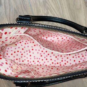 Shiny black bag with dust bag. 1 zippered interior pocket, 1 slip pocket interiorly and zippered closure. Very cute and elegant bag.
