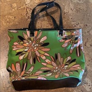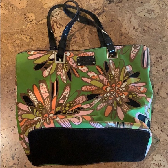 Kate Spade tote bag in colorful pattern! Brown patent leather straps and base. Nylon material in green with colorful flower patterns. Red inside in that classic Kate spade pattern. 1 zip pocket and 2 slip pockets inside. No tears or blemishes. Great carryall and cute purse!
